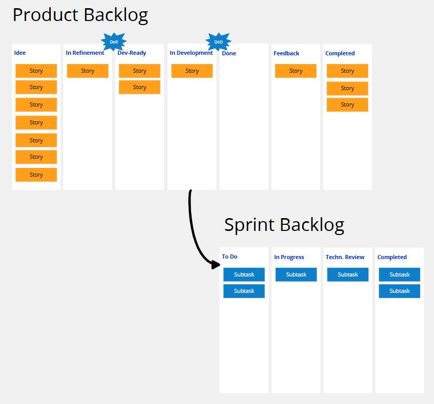 Mit dem Board sieht man schnell, ob eine ausreichende Anzahl an vorbereiteten Items für den nächsten Sprint zur Verfügung steht und wo es möglicherweise Engpässe gibt. (Hinweis: Für die grafische Darstellung wurde bewusst ein eher einfacher Prozess ausgewählt, um die Darstellung nicht zu überfrachten. Dieser kann natürlich in der Realität weitere Schritte enthalten.)